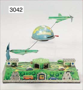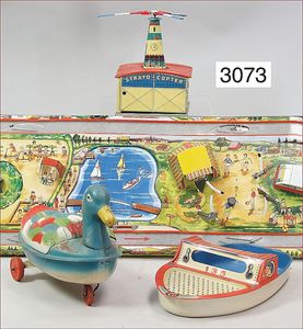 4 Teile Blech, bespielt, 1 x Spielplatz, 70 cm x 23 cm, nicht komplett, kl. Blechboot, 20 cm, Flughafengebäude, 1 Blechente, zum Öffnen auf 3 Rädern, gemarkt Made in U.S.-Zone, altersbed. Farbabplatzer u. kl. Roststellen, Länge 23 cm
