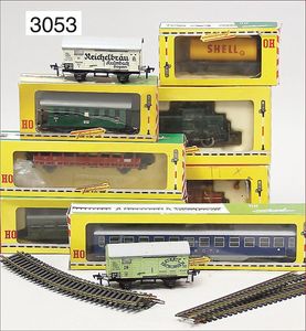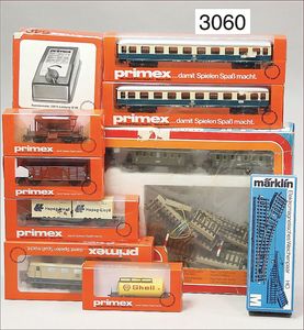 PRIMEX u. MÄRKLIN H0, Set, Lok mit 2 Waggons, Trafo u. einige Teile Gleismaterial, dazu Primex Waggons u. Trafo, 1 E-Lok, Nr. 3199, alles Orig.-verpackt