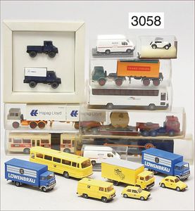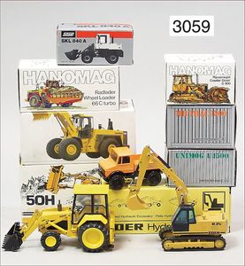 schönes Konv. Metallbaufahrzeuge, Maßstab 1:36, Hanomag? Radlader, Planierraupe, Hydraulikbagger von Eder, 2 x Modelle Mercedes Benz, Trac 1500, Unimog, alles in sehr gutem Zust.