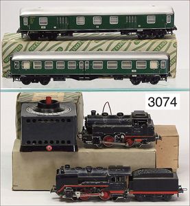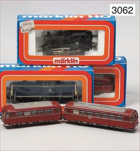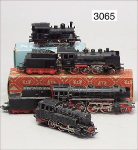MÄRKLIN H0, 4 Lokomotiven, 2 x mit Tender, 1 x TM 800, 3005, TM 800 ohne Tender, 1 x 3-achsige Tenderlokomotive, im Orig.-Kart., Nr. 3029, alles bespielt