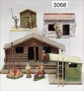 2 x Blockhütte, mit Massefiguren, darunter 2. Weltkrieg, Engländer sowie Kolonialtruppen, 1 x Mann mit Gasmaske, 1 Figur Kunststoff, später