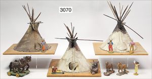 3 x Tipi (Leder), dazu Massefiguren, 7 cm - 7,5 cm, Lagerfeuer, Bär mit Indianerin, dazu 4 Zugpferde, altersbed. Lackfehler, 11,5 cm