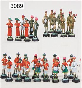 Konv. außergew. Ton-Masse-Figuren, indische Unabhängigkeitsarmee, Höhe 6 cm, 28 Teile, Männer und Frauen, meist Musiker, schöne Orig.-Bemalung, mit einigen Beschädigungen (fehlende Arme), ausgefallen