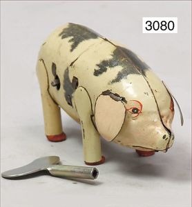 Zappelschwein, Blech, gemarkt Made in U.S.-Zone Germany, Uhrwerk intakt, bespielt, altersbed. an kl. Stellen etwas Farbabrieb, 11 cm