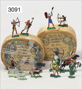 HEINRICHSEN Konv. flache Zinnfiguren, 4 cm, große Spanschachtel, Eingeborene, ausgefallen, ca. 100 Teile