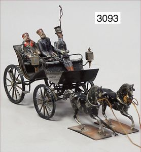 wohl Rock & Graner, Biberacher Blech, Kutsche, ca. 1880, mit 2 Zink-Pferden, Kutscher, 2 Personen, schöner Orig.-Zust., mit altersbed. Lackfehlern, museal, 30 cm