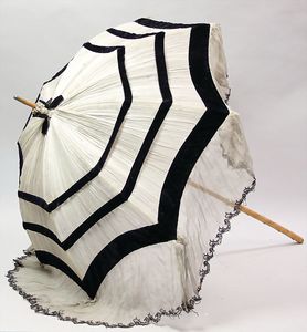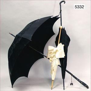 Konv. Damenflanierschirme, 1 Flanierschirm, eierschalenfarbener Stoff, Knauf wohl Bein, filigran geschnitzt, 65 cm, 1 x Flanierschirm, schwarze Seide mit feinen Stickereien, Griff Holz fein geschnitzt, 97 cm lang, 1 Flanierschirm, schwarze Seide, feine Stickereien, mit Holzgriff, 91 cm