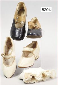 Konv. 2 Paar Kinderschuhe, 1 x Kinderschuhe für Junge, Leder, schwarz/beige, links 2 Knöpfe seitl., 18 cm lang, dazu feine Mädchenschuhe, leichter Pfennigabsatz, Sohle genagelt, Gr. 26, weißes weiches Kalbsleder, 1 Knopf, 17 cm lang, mit Orig.-Verkaufsschild, schöner Zust.
