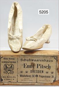 Damenschuhe, Paris, 1989, im Orig.-Kart., von Emile Pitsch Schuhwarenhaus Dresden, weiße Seidenschuhe mit Absatz, genagelt, gemarkt Ives Barrés, Siede an vereinzelten Stellen teilw. etwas verschlissen, 26 cm lang, kl. Absatz, Seidenschleife