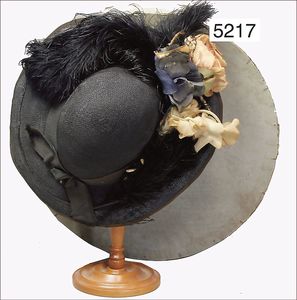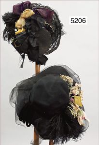 Konv. 2 Damenhüte, 1 x Damenhaube, schwarz, ca. 1900, mit Straußenfederbesatz, Stoffblumen, dazu 1 Damenhut, schwarzer Tüll, teilw. etwas verschlissen, Stoffblumenbesatz, schwarze Straußenfedern