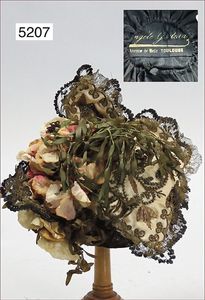 Damenhaube, ca. 1890. gem. Avenue de Metz/Toulouse, innen schwarze Seide, außen prächtiger Stoffblumenbesatz, Pailletten sowie leonisch Drähte, 18 cm Durchm. Ausgefallen