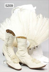 Biedermeier, Damen-Stoff-Stiefel, mit genageltem Absatz, seitl. Knopfreihe, innen Nesselstoff, 25 cm, schöner Orig.-Zust., dazu 1 Fächer, wohl asiatisch, Straußenfeder, 40 cm hoch, 50 cm breit, ausgefallen gearbeitet, schönes Konv.