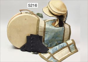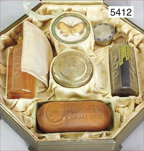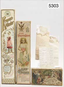Konv. Kartons, von bekannten Modeherstellern, 1 Kart. Mieder, mit bunt lithogr. Papier beklebt, 41 cm lang, 8 cm breit, teilw. etwas verschlissen, seitl. mit Klebeband etwas ausgebessert, 1 Kart. "Neuste Wiener Mode, Reformmieder", bunt lithogr. Papier, 34 cm lang, 8 cm breit, Ecken etwas abgegriffen, 1 Kart. für Seife, gemarkt Boering & Co., Frankfurt am Main, mit handkoloriertem Frontbild, schöner Orig.-Zust., 16 cm lang, 9 cm breit, an den Seiten teilw. etwas verschlissen, dazu 1 Dinnerkarte, von 1909, Dinner naissance petit antoine de waene 1909, Fastnachtsballkarte, 22. Februar 1898, ausgefallen