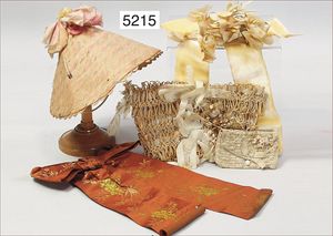 Konv. Damenhüte, Holz geflochten, 1x trichterförmig, 20 cm Durchm., 1x Damenhut, Innenfutter Seide, hellblau, etwas aufgegangen, 16 cm Durchm., dazu Ausschmückungsteile für Damenhauben, Seidenschleife, asiatisches Muster, Samtschleife, schönes Konv.