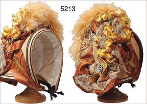 herrschaftl. Damenhaube, vor 1900, mit prachtvollem Stoffblumendekor u. Federschmuck, dazu kupferfarbene Seide, schöner Orig.-Zust., 18 cm breit