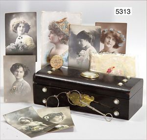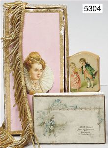 Biedermeier-Schatulle (Karton), Innenseite mit Stoffband geklebt, Vorderseite mit geprägten Bild von Queen Elisabeth, Rückenseite handkoloriertes Damenbild, 9,5 cm breit, 12 cm hoch, dazu 2 kl. Kart., Biedermeier