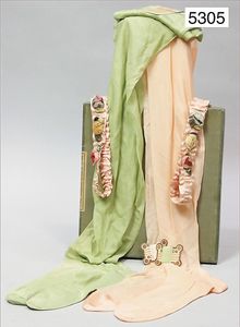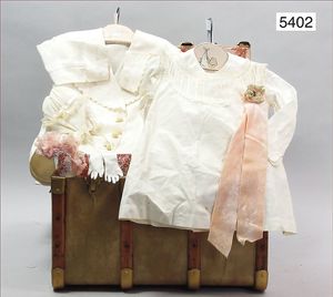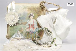 Schatulle mit Seide bezogen, Deckel mit handbemalter Damenszene, gemarkt Ternier, Innenseite gefüttert, 37 cm breit, 36,5 cm tief, unten 4 Füße, beiliegend langer Tauf-Seidenschal, mit großer unberührter Stoffblume (Haarschmuck), florale Haarkränze, schönes Konv.