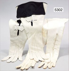 Konv. Feine Damenhandschuhe, 1 x Stoffhandschuhe, weiß/schwarz, mit breiten Ärmeln, umgeschlagen, kl. Schlaufe mit Brosche, dazu lange schmale Lederhandschuhe, weiches Rindsleder, 2 Knöpfe, für schmale Hände, altersbed. etwas vergilbt