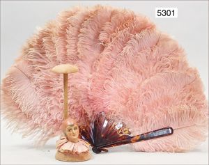 Konv. 30er Jahre, Damen-Federfächer, altrosé, sehr schöner Orig.-Zust., 40 cm lang, dazu 1 ausgefallener Hutständer, mit Samtbezug, 26 cm hoch, mit Masse-Damenkopf, fein ausmodelliert, Nase bestoßen, roséfarbener Seidenkragen, etwas ausgeblichen, schönes Konv.