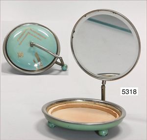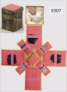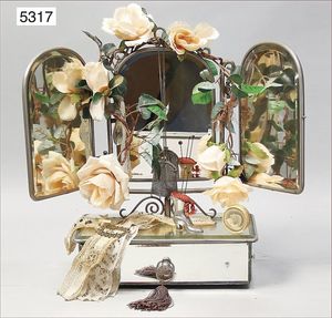 Damen-Spiegelschrank, mit reichhaltigem Zubehör, silberner Schuh als Nadelkissen, Papierblumendekor, Breite aufgeklappt 57 cm, Höhe 43 cm, schönes Beistellwerk, dekorativ