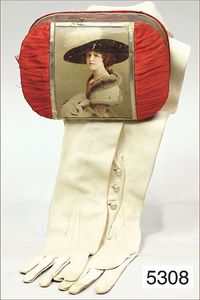 BIEDERMEIER Schatulle, mit lithogr. Papier beklebt, Szene Dame mit Pelzmuff, seitl. Seidenarbeit, stark verschlissen, Innenfutter bordeauxfarbene Seide, 16 cm breit, 11 cm tief, dazu 1 Paar weiße Damenhandschuhe, schönes Dekorationsstück