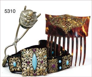 Konv. 1 Biedermeier Gürtel, prachtvolle Schnalle, mit türkis- u. fliederfarbenen Steinen, mit filigran gearbeiteten Messing-Ornamenten, 1 Haarkamm, wohl 1 x geklebt, ausgefallen, 10 cm hoch, 10 cm breit, 1 Dochtschere, Frankreich, Silber, gestempelt