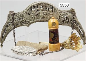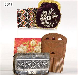 Konv. 4 Teile, 1 x Holz-Haarkamm, geschnitzt, 12,5 cm hoch, dazu 1 Portemonnaie, Leder, mit Silberornamenten, gestempelt ELC, altersbed. Abnutzungsstellen, 1 Portemonnaie mit floralem Goldbügel, lilafarbener Samt mit Paillettenschmuck, Innenfutter Stoff, 1 Perlenflacon, 12 cm hoch, 1 Seidenstoffstück, mit Blumenstickerei, 13 cm x 11 cm