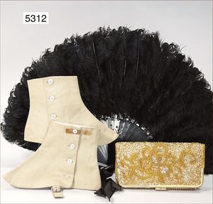 Konv., 1 Fächer mit schwarzen Straußenfedern, Halter mit floraler Stickerei, dazu 1 prachtvoll perlenbesticktes Portemonnaie, 50er Jahre, goldfarbene Seide, prachtvoller Paillettenbesatz, mittig Metallreisverschluss (Clutch), 20 cm breit, unaufgeklappte Höhe 12 cm, 1 Paar Herren-Gamaschen, beige, 4 Knöpfe seitl.