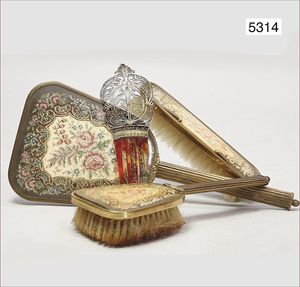 Ausschmückungsteile für Frisiertisch, 1 Spiegel, Messing/Blech vergoldet, hinten mit petit Fleure Arbeit, 27 cm, dazu passend, 1 Bürste, 21 cm, 1 Bürste Breite 16 cm, 1 filigran geschliffene Glasschatulle, Länge 9 cm