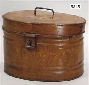Hutschachtel, Groninger Cartunnagefabrik E.J. Bierling, Groningrm, Pappe, 41 cm Durchm., mit schwarzem Holz geflochtenem Hut, Straußenfedern und Papierblumenschmuck, Heuser Bremen, 16 cm Durchm.