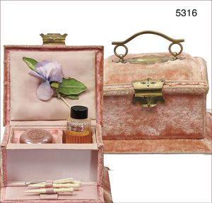 Schatulle, altrosefarbenes Samt, aufklappbar, innen mit Bein-Utensilien, Parfümflacon, Stoffblumendekor, Messingverschluss, 16 cm breit, 10 cm hoch, auf 4 Messingfüßen, schöner Zust.