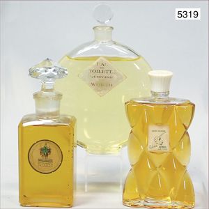 3 gr. Parfümflacons, 1 x rund, Eau de Toilette "Je reviens" 80 Worth Paris, 26 cm hoch, 17 cm breit, 1 x Eau de Cologne furvil Paris, 22 cm hoch, 1 x Potter & Moure´s mitchan lavender London, 23 cm hoch, ausgefallener Verschluss, geschliffenes Glas