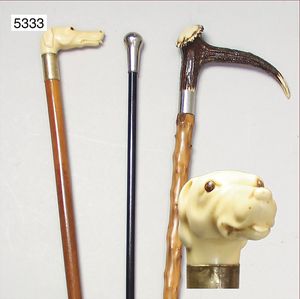 Konv. Gehstöcke, 3 Stück, 1 x Gehstock mit Dackelkopf (wohl Bein), fein ausgearbeitet, mit bernsteinfarbenen Augen, 86 cm, 1 Gehstock, mit massiv ausgearbeitetem Holz, 88 cm, 1 schwarzer Gehstock, Silberknauf, 85 cm