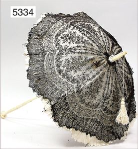 Damen-Flanierschirm, Halter aus Bein gearbeitet, transparente Spitze, altersbed. kl. Loch, sonst schöner Zust., dazu passendes Samtband mit Stoffblüte, zum Verschließen