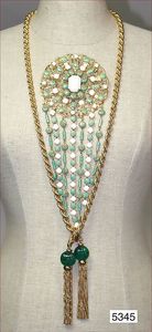 BIJOUX CASCIO lange Kette, Endstück mit 2 grünen geschliffenen Glaskugeln, dazu ausgefallene Brosche, bestickt mit weißen und türkisfarbenen Perlen, mit Blumendekor, orientalisch, 10 cm Durchm., ausgefallen