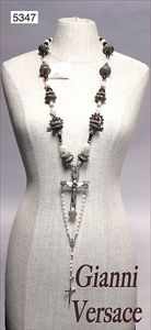 VERSACE Modeschmuck, Rosenkranz, 2-seitig tragbar, 1 x Kreuz auf Brust, 1 x Kreuz auf Rücken, mit braunen Holz-Perlen, sowie Perlen- und Metallschmuck, ausgef., mit Etikett