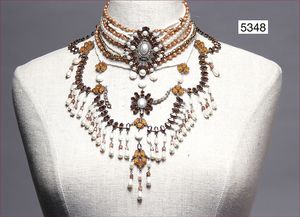 Modeschmuck, 2 prachtvolle Colliers, 1 x eng anliegendes Colier mit Perlenbesatz, braune Strasssteine, dazu 1 eng anliegende Perlenkette, blumenförmig, gem. Vuta Pasch