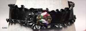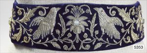 Konv. 3 Gürtel, 1 x Gürtel, älteren Datums, mit Silber-Bestickungen, royalblau, Samt, Glasperlenbesatz, Unterseite Seide, florales Muster, mit 2 Vögeln, dazu 2 neuwertigere Taillen-Gürtel, 1 x Taillengürtel, Schlangenleder-Optik, aus Pailletten, schwarz, Stretch mit Gummizug, dazu 1 gold/weißer Gürtel