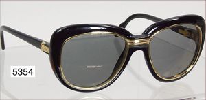 CARTIER PARIS ausgefallene Damensonnenbrille, gemarkt Cartier Paris, 135 Made in france, schwarz/goldfarben, schwarze Gläser mit goldenem Spiegelreflex, für schmalen Kopf, ca. 1990, mit Phyton Etui, original?, ausgefallen