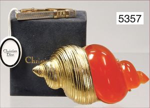 CHRISTIAN DIOR Feiner Damen Modeschmuck, 1 x Kettenanhänger, Muschelform, goldfarbend, bernsteinfarben geformter Stein, 11 cm hoch, ( auch als Brosche zu tragen), 1 x Christian Dior, Klammer in der Orig. Schatulle, goldfarben, 5,5 cm, neuwertig