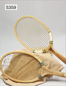 Konv. Tennisschläger, ca. 1920, Aufdruck "Sporthaus GmbH Chemnitz Clown u. Sporthaus Karl Bieber München", 1 Schläger Innenseite etwas ausgebessert, 68 cm, im Orig.-Aufbewahrungssack