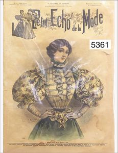 franz. Zeitungsausschnitt von 1896 "Le petit echo de la mode 5648", handkoloriertes Damenbild, auf Frontseite mit prächtigem Kleid, 45 cm hoch, 32 cm breit, an den Seiten teilw. etwas verschlissen, auf Pappe, 4-lagig