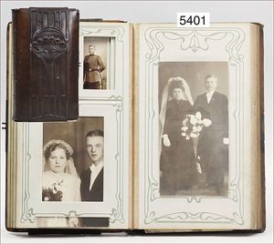 ausgefallenes Fotoalbum, Ledereinband, mit Bronze-Jugendstilmotiv, altersbed. etwas abgegriffen, teilw. mit alten Fotografien, Innenseiten gold eingefasst, 24 cm hoch, 20 cm breit, 13 Seiten