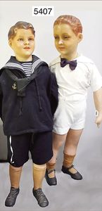 Schaufensterpuppen-Szene, ca. 1910, 2 Puppen, 1,05 m hoch, Jungen, Wachsbrustblatt-Kopf, fein ausmodellierte Haare, gemalte Augen, geschl. Mund,, Holz/Masse-Körper, mit eingesteckten Armen, 1 Puppe ohne Arme, andere Puppe Finger an einer Hand komplett sowie der Daumen weggebrochen, andere Hand Daumen fehlt, schöne alte Matrosen-Kleidung, alte Schuhe, kleine Botanisiertrommel, 1 Segelschiff, 30er Jahre, kleine Massepuppe, mit Stoffkörper, dekorative Szene