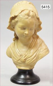 Büste, junge Frau, aus Speckstein, fein ausmodelliertes Gesicht, leicht lockige Haare, Haube, 42 cm hoch, ausgefallen, sehr dekorativ