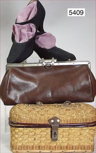 Konv. 1 Holz geflochtener Trousseau, 1 x Ledertasche ca. 1920 ( kleine Arzttasche ), Innenfutter cognacfarben, Leder geflochtener Trageriemen, Gebrauchsspuren, dazu 1 Paar alte Schuhe ca. 1930, schwarzer Stoff, kleine Größe