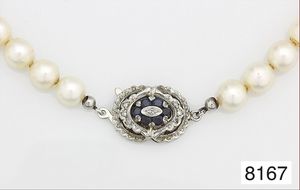 CHARLSTEN-KETTE um 1920, GG/WG 585/000, Altschliff-Diamanten & Dia-Rosen, feine Saatkorn-Perlen (geflochten), Troddel aushängbar, mit Diamanten u. Onyx (?) ausgefasst, hinten feine Schließe mit Diamant-Rosen, L. ca. 70,0 cm