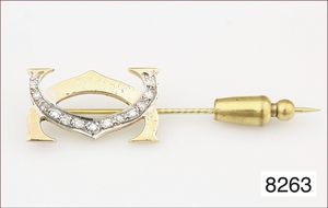 Feine ART-DECO, Nadel um 1920, GG 585/000, Platin, 5 Altschliff-Diamanten ca. 1,7 ct, weiß, Diamantrosen ca. 0,18 ct, (Punzierung beidseitig auf Nadelverstiftung, nicht leserlich), Länge ca. 64,5mm