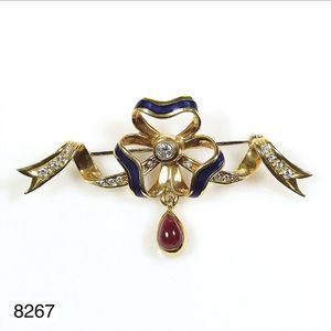 Brosche, 1te Hälfte 20tes Jhdt. Silber, blaues Emaille in Blüten, 3 rote Steine, ca. 3,7 cm