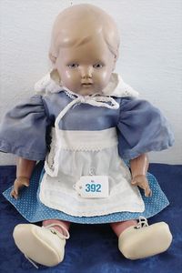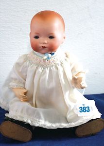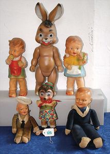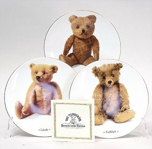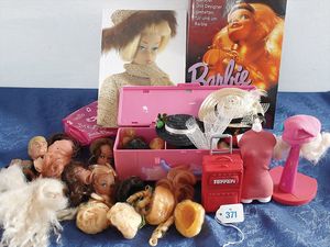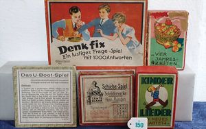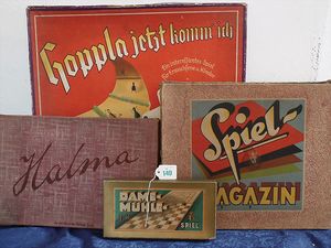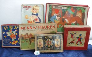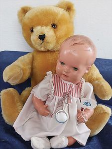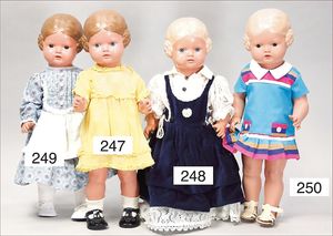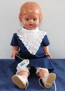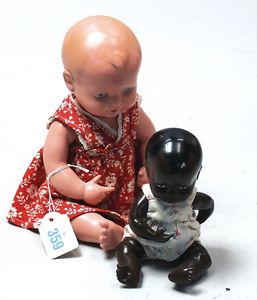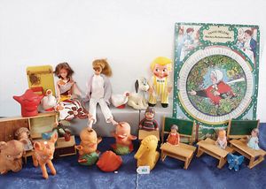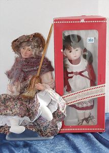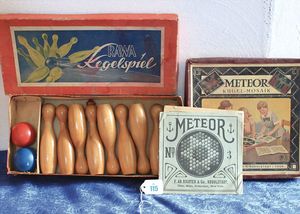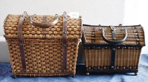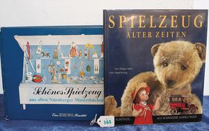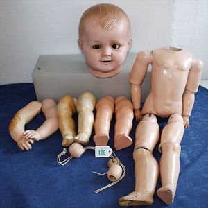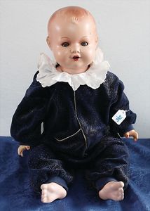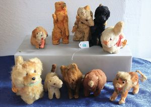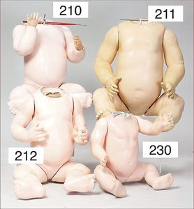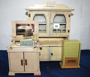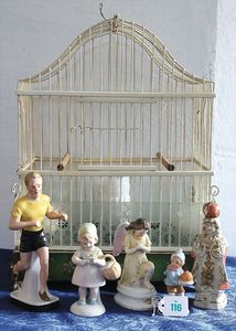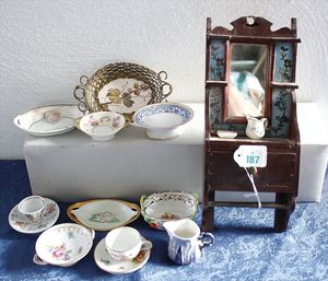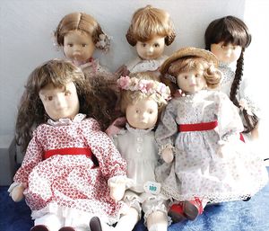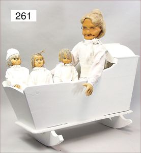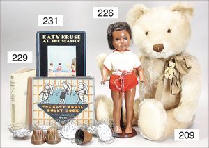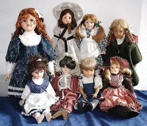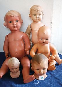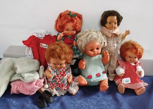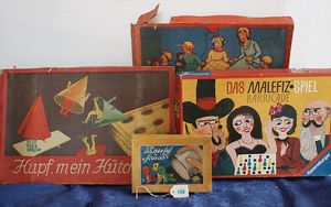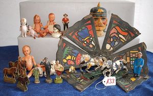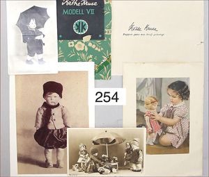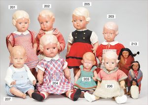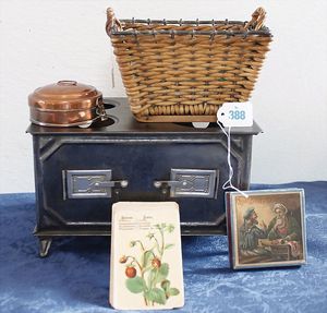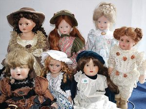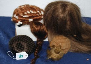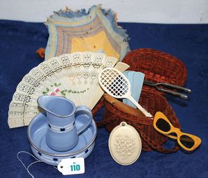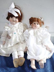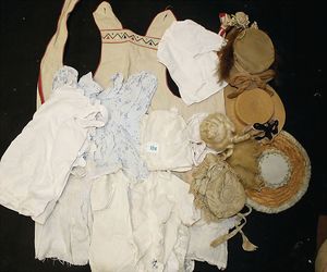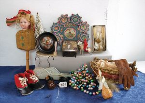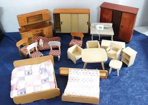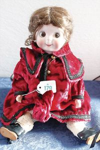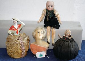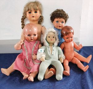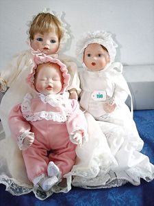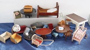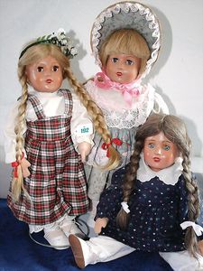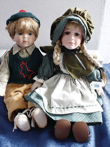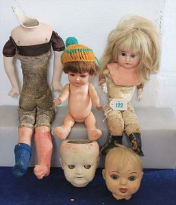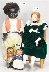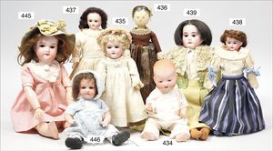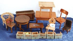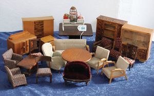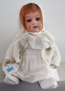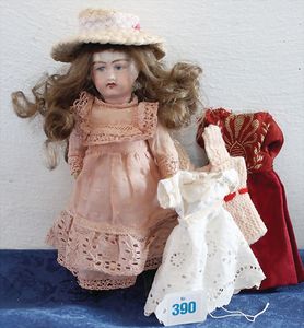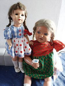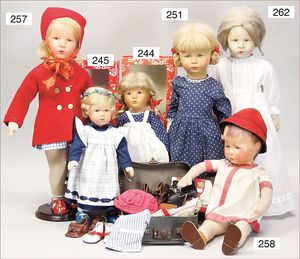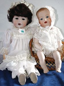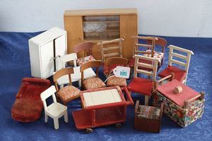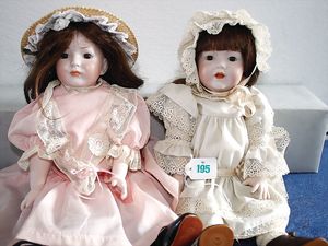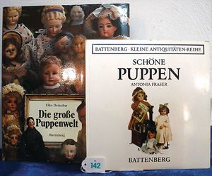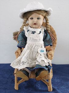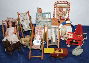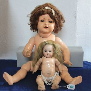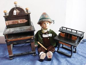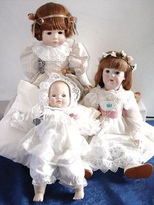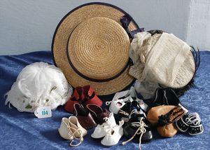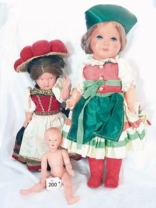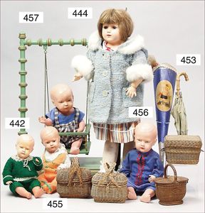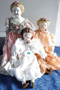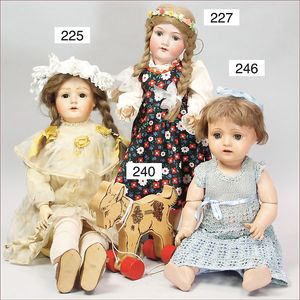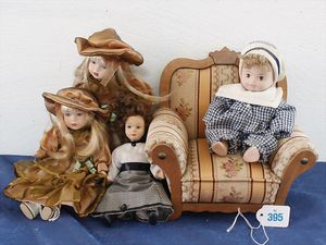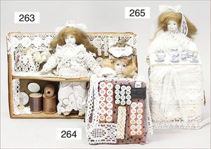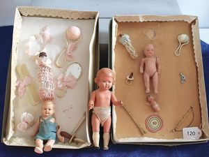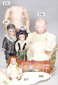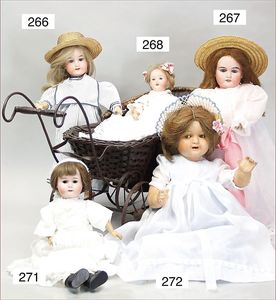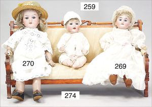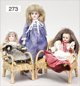 3 kl. Porzellankopf-Puppen, 1 x Brustblatt, gem. AM, blaue Schlafaugen, off. Mund, Zähne, Echthaarperücke, Stoffkörper, Porzellanarme, 25 cm, 1 x gemarkt Germany, braune fest eingesetzte Glasaugen, offf. Mund, Zähne, Echthaarperücke, Masse-Stehkörper, mit anmodellierten Stiefeln u. Strümpfen, 20 cm, 1 x gemarkt F. & W. Goebel 120, blaue fest eingesetzte Glasaugen, off. Mund, Zähne, Echthaarperücke, Masse-Stehkörper, anmodellierte Schuhe u. Strümpfe, 17 cm, dazu 2 Teile Korbmöbel